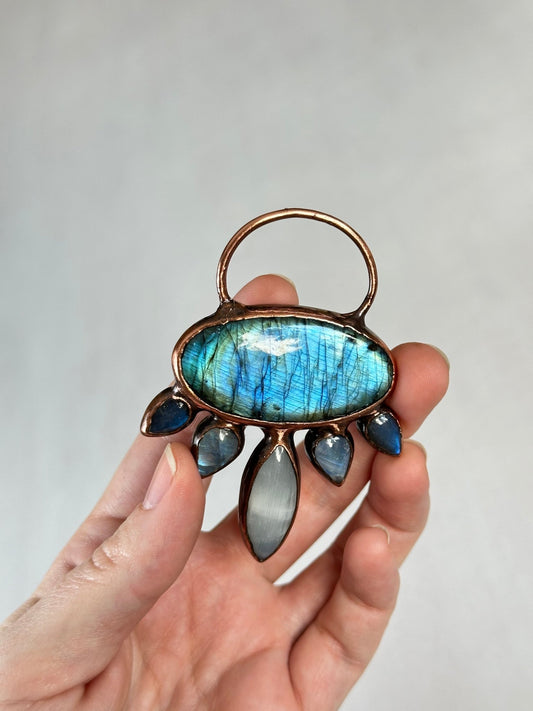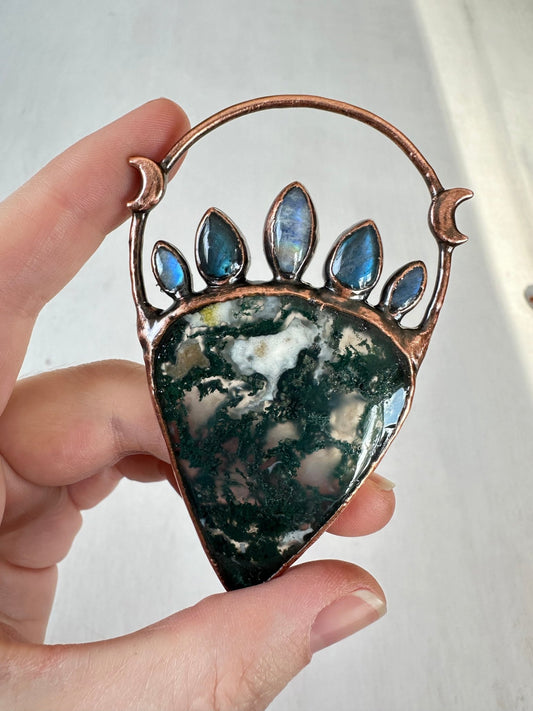 Our electroformed pendants consist of authentic gemstones layered in pure copper. We design each pendant by hand and suspend the stones into a copper forming acid. We then push low amps into the acid forming the copper onto the stones. Each pendant is handcrafted from start to finish and a unique piece of art.