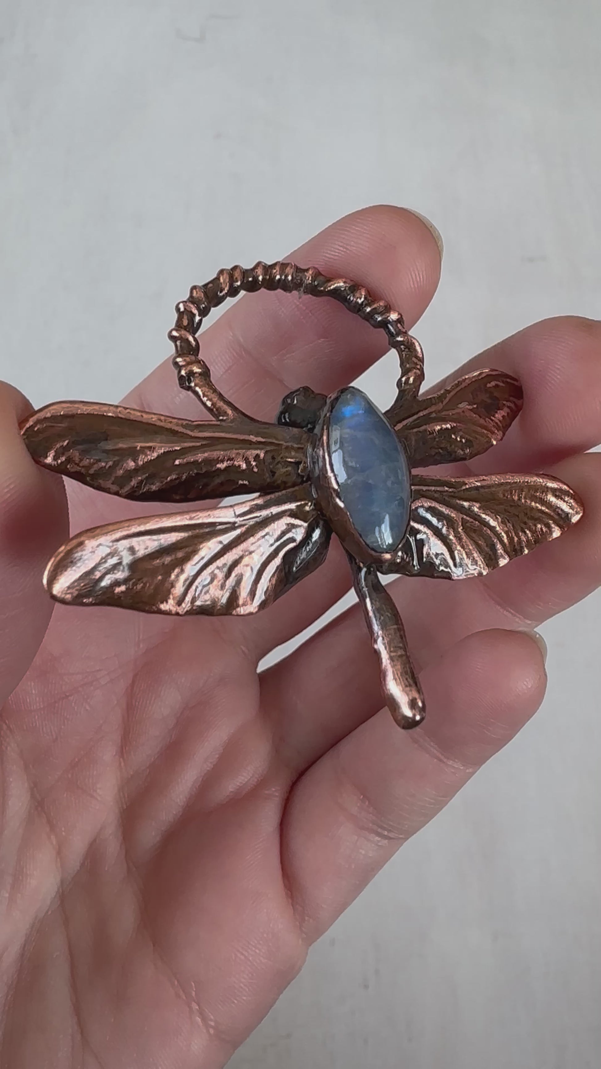 La libellule était recouverte de plusieurs couches de cuivre et ornée d'une pierre de lune flashy sur son dos.