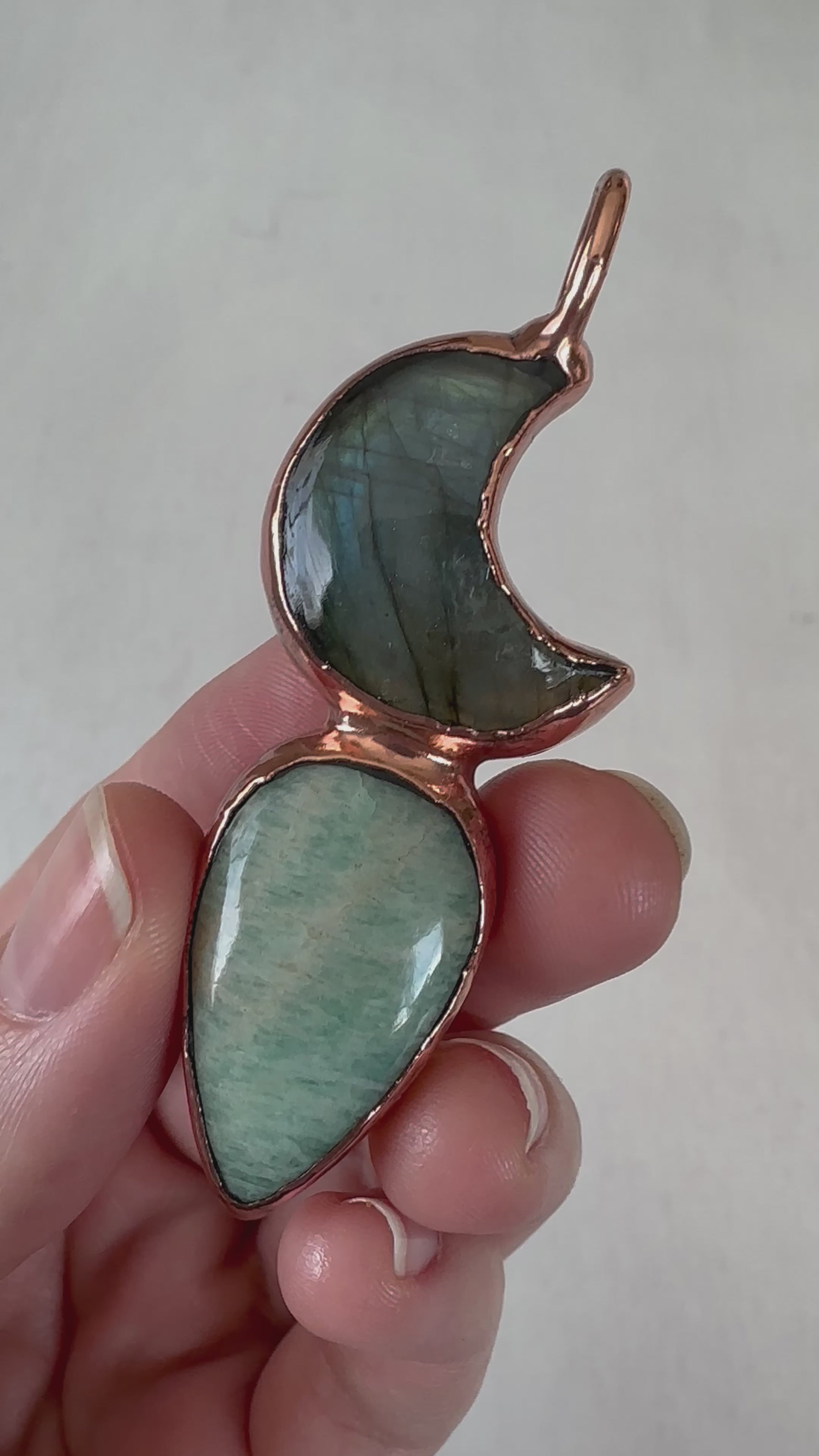Ce joli petit pendentif en labradorite et amazonite est composé à l'origine de deux cabochons de pierres précieuses. Ils ont été électroformés avec du cuivre et polis pour imiter l'or rose.
