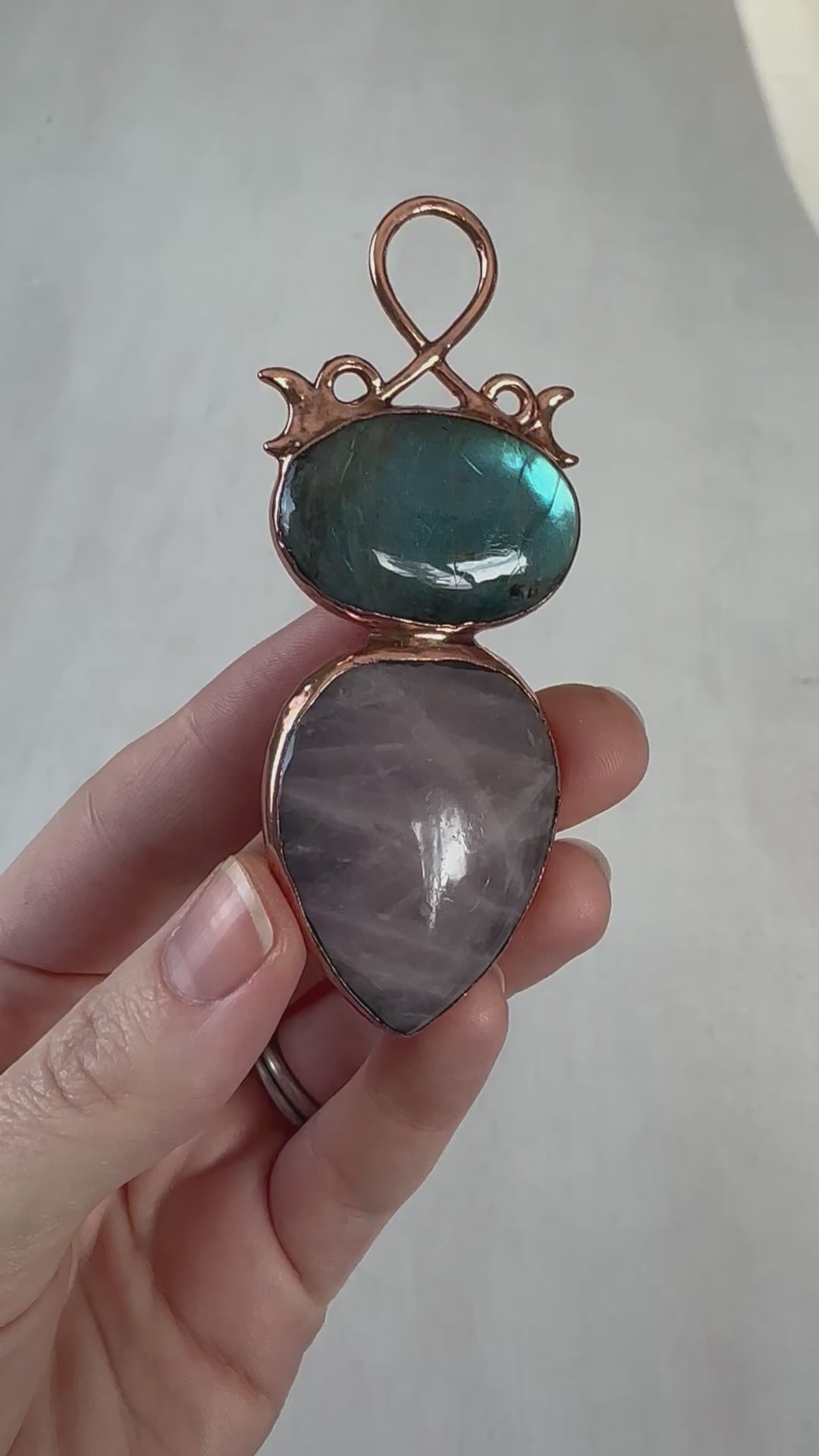 Ce pendentif est orné de labradorite et de quartz rose. Il a été recouvert de cuivre brut, puis poli pour lui donner une couleur similaire à l'or rose. Il a également été laqué.
