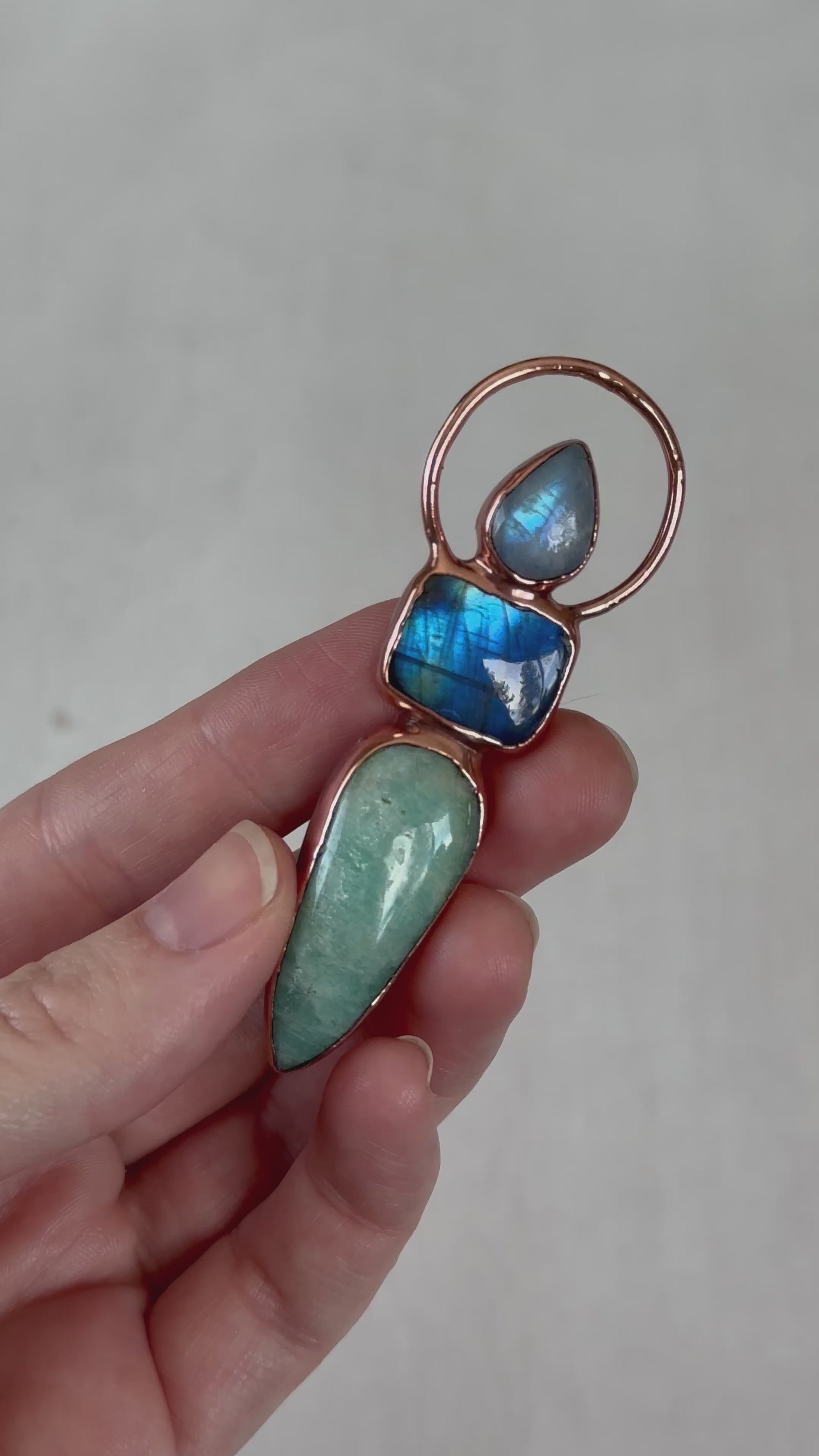 Cette pierre de lune, cette labradorite et cette amazonite sont des cabochons sculptés, assemblés et plaqués en cuivre. Le cuivre a été poli pour imiter l'or rose.