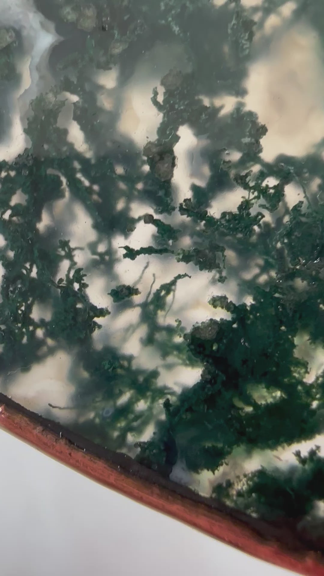 Ce pendentif géant en agate mousse est orné d'une couronne de pierre de lune et de labradorite. Il a été recouvert de cuivre, oxydé pour obtenir un cuivre antique foncé. Il a été poli pour briller et scellé.