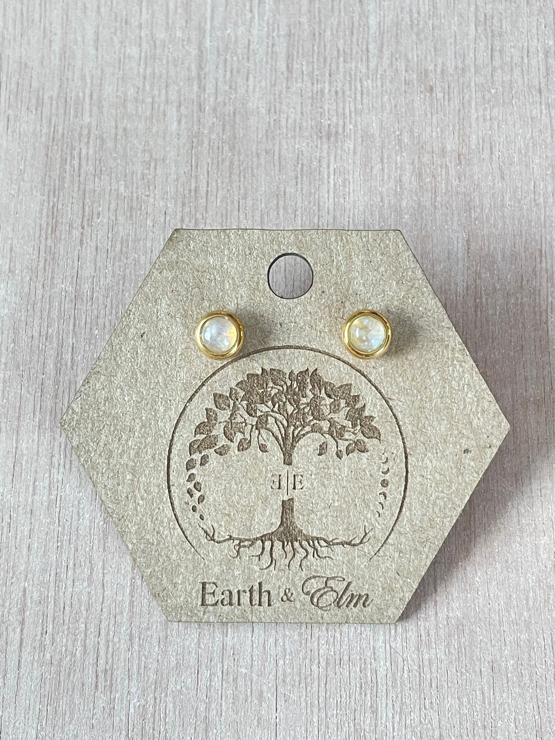 These earrings start out as rough stone that is carved into small cabochons. The cabochons are prepped for post backs and attached to surgical stainless steel posts. We use UV resin to create a waterproof and long lasting connection.