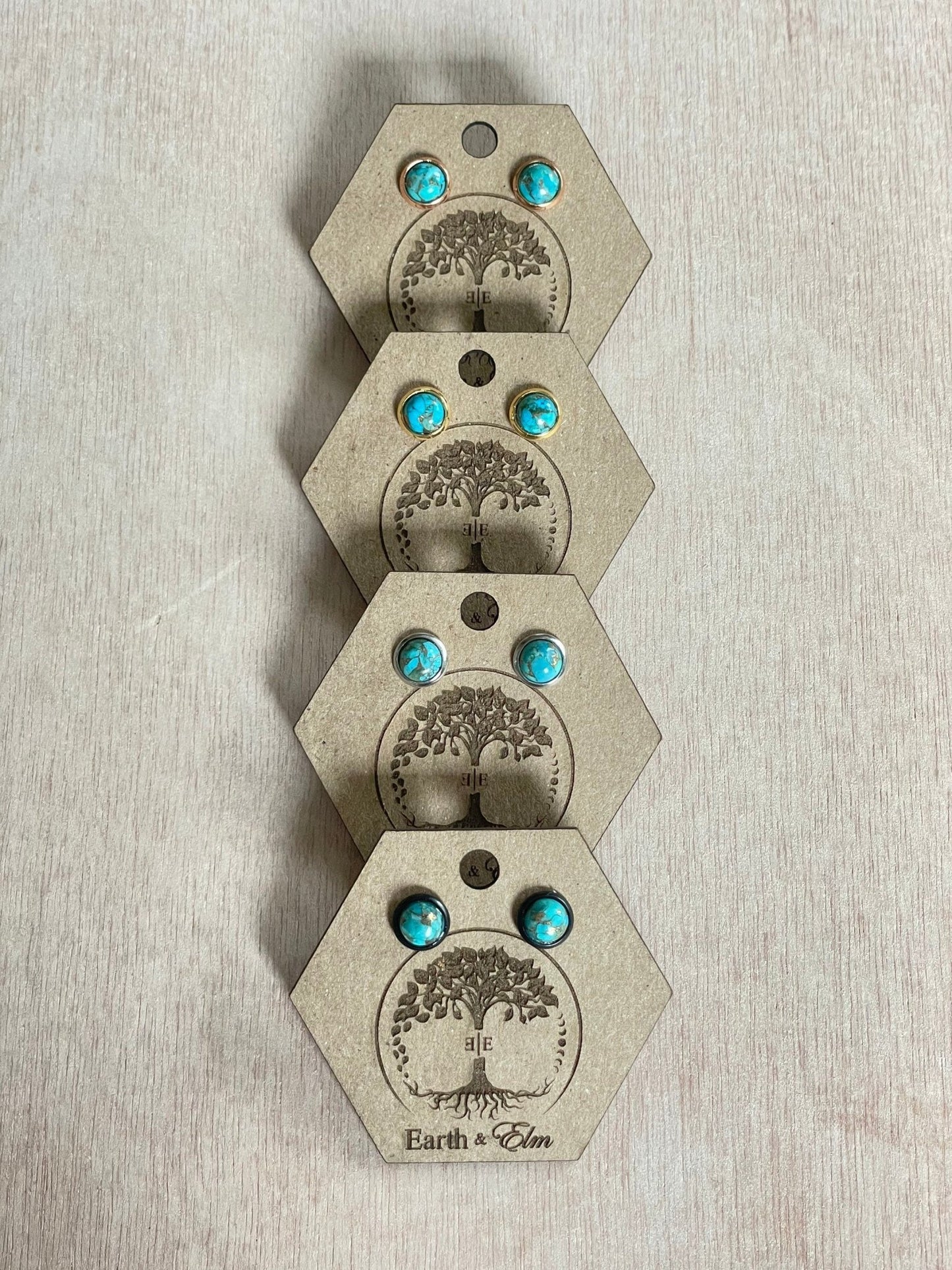 These earrings start out as rough stone that is carved into small cabochons. The cabochons are prepped for post backs and attached to surgical stainless steel posts. We use UV resin to create a waterproof and long lasting connection.