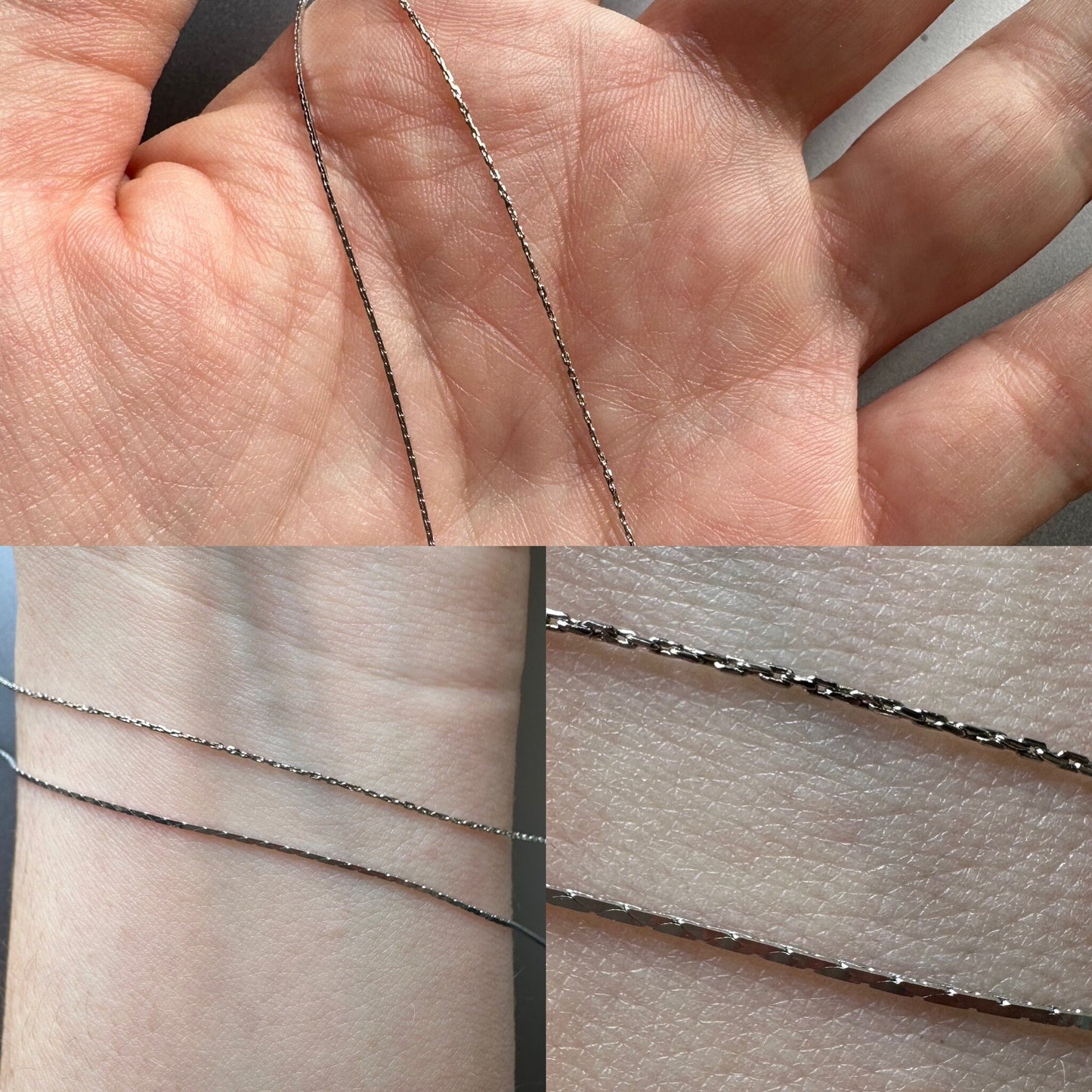 For chain options, I have my regular dainty chain that is featured in the first photo. The last two photos show the thinnest ever chain option. At 0.65millimetre this chain is micro.