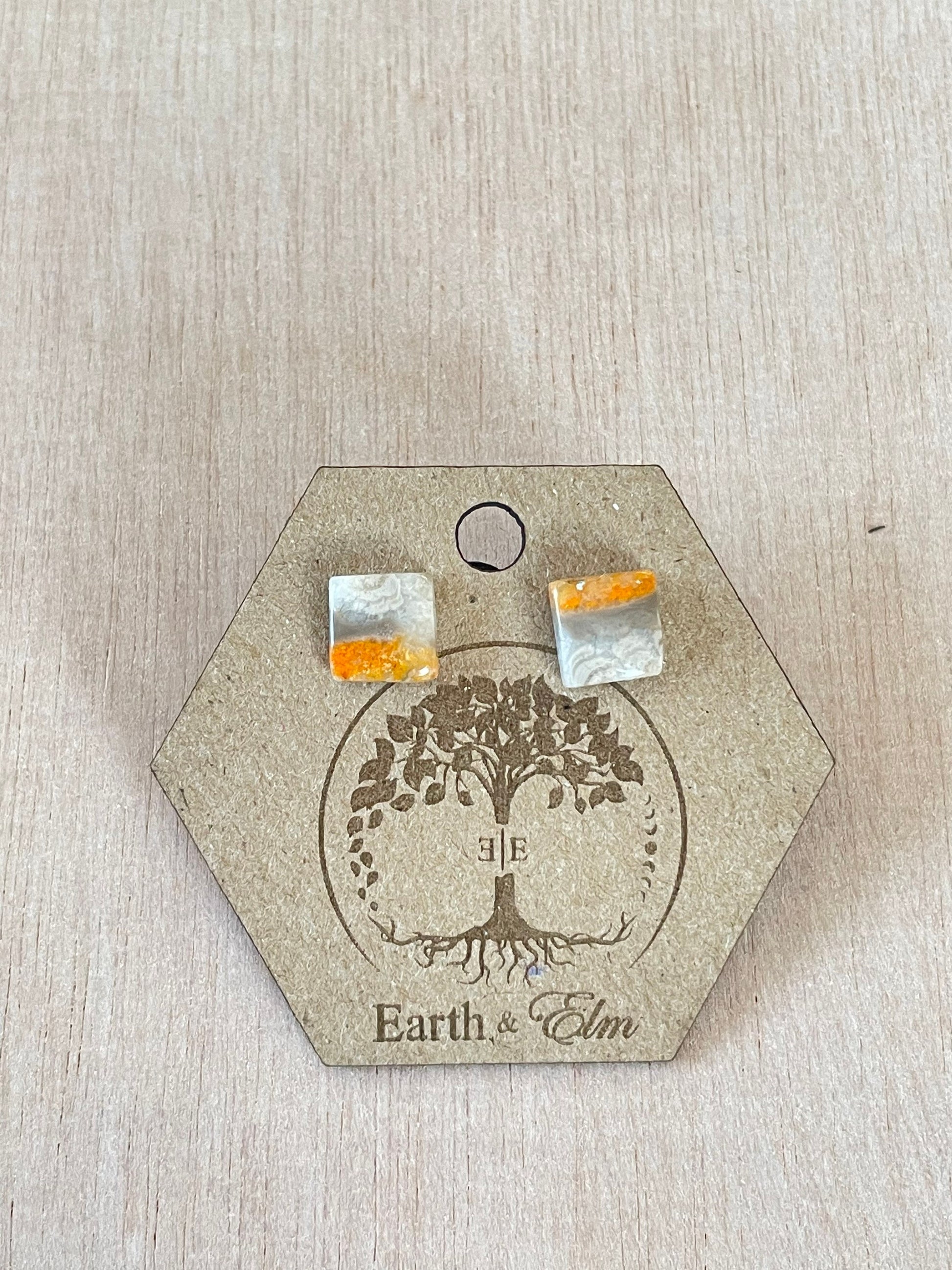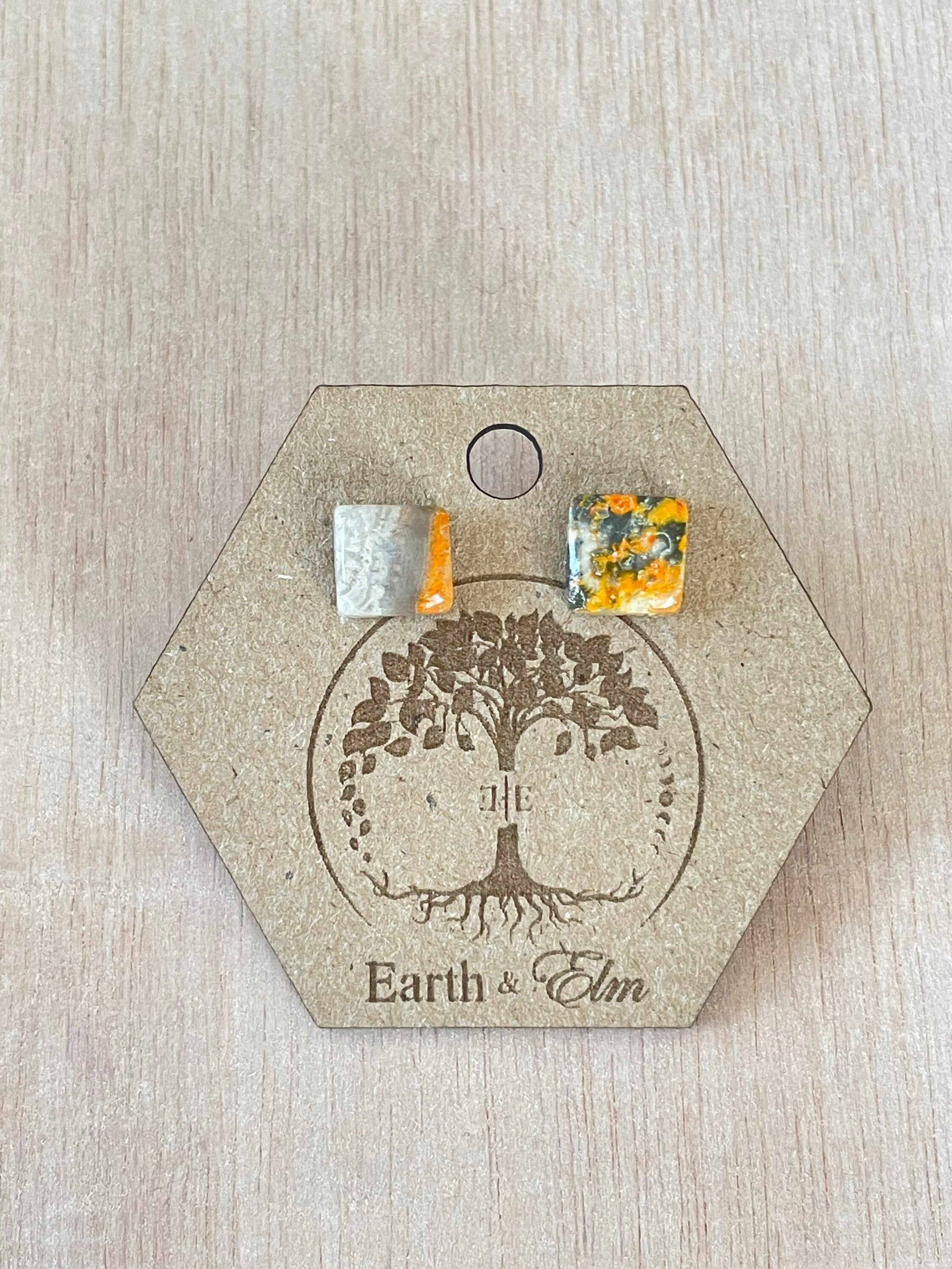 These earrings start out as rough stone that is carved into small cabochons. The cabochons are prepped for post backs and attached to surgical stainless steel posts. We use UV resin to create a waterproof and long lasting connection.